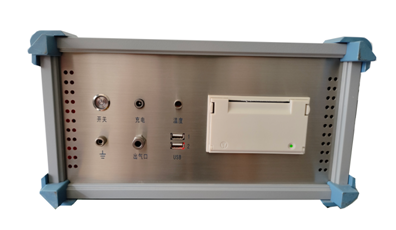 后面板由開關(guān)、出氣口、USB插口、微型打印機(jī)、環(huán)境溫濕度、充電口、接地端組成