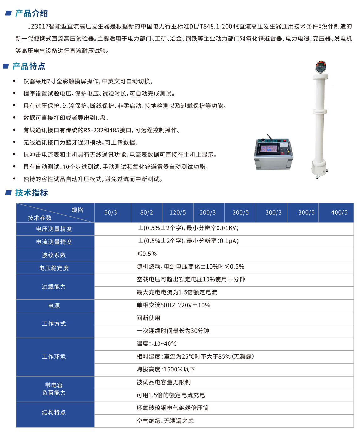 JZ3017智能型直流高壓發(fā)生器是根據(jù)新的中國電力行業(yè)標準DL/T848.1-2004《直流高壓發(fā)生器通用技術條件》設計制造的 新一代便攜式直流高壓試驗器。主要適用于電力部門、工礦、冶金、鋼鐵等企業(yè)動力部門對氧化鋅避雷器、電力電纜、變壓器、發(fā)電機 等高壓電氣設備進行直流耐壓試驗。