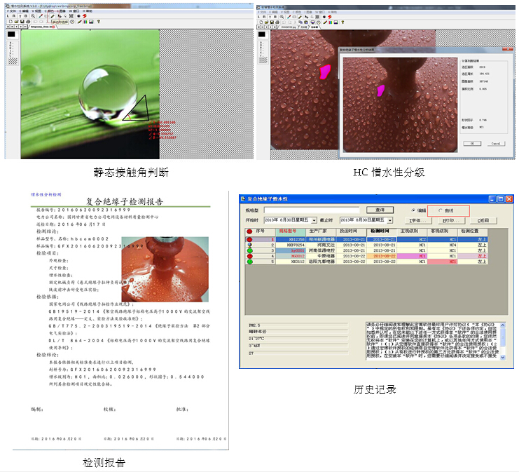 憎水性分析軟件根據(jù)檢測人員在現(xiàn)場獲取的絕緣子噴水后圖像,可對現(xiàn)場拍攝提取圖像作一些常規(guī)的處理,準(zhǔn)確判斷圖象中水珠形狀所代表的靜態(tài)接觸角和絕緣子的憎水等級。系統(tǒng)圖象的預(yù)處理軟件設(shè)置了基本的圖象處理功能,如:剪切、粘貼、放大、縮小、中值濾波和圖像旋轉(zhuǎn)。圖像處理功能可以進(jìn)一步改善圖像質(zhì)量,但是通常不必使用預(yù)處理功能,就可以對圖象的憎水等級進(jìn)行判斷,通過兩種分析結(jié)果可直觀判斷出被測試品當(dāng)前的憎水性能。