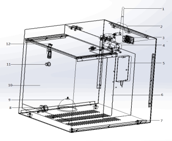 凈化系統(tǒng)組成部件:1、改進后433M無線通訊模塊;2、把手、3、電源插口;4、空氣泵;5、電源模塊;6、吸附劑氣室;7、萬向輪;8、排水口;9、氣泡石;10、316不銹鋼內膽;11、排氣口;12、注水口